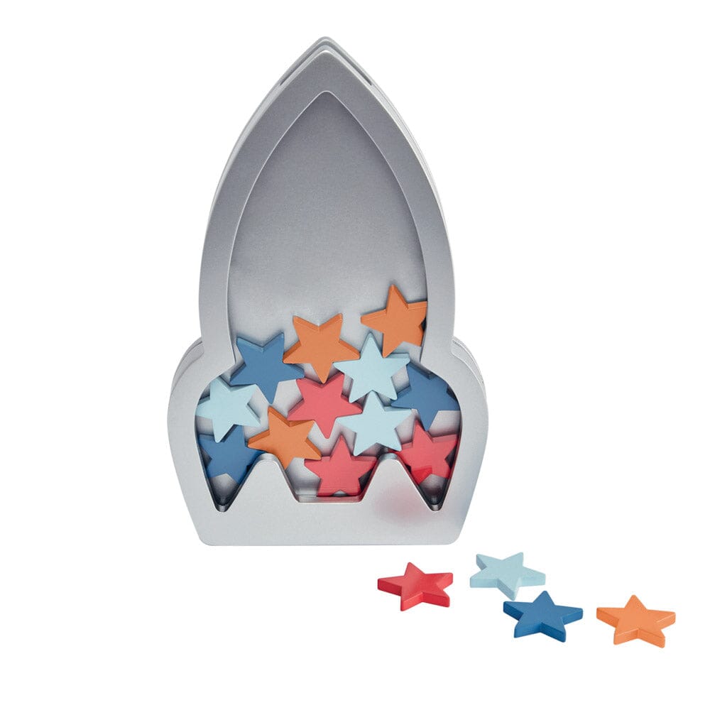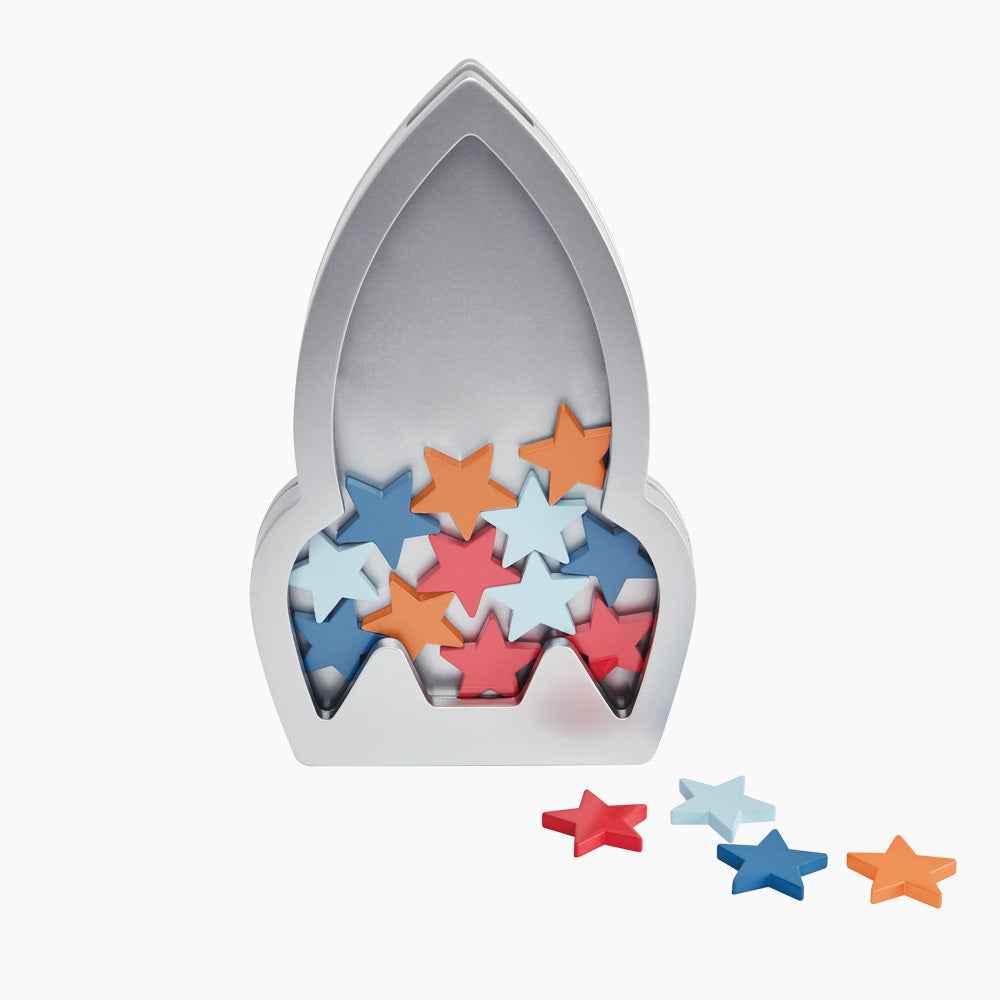 It has a painted finish and clear panel so children can see it filling up. It comes with 16 multi-coloured stars and is held together by magnets making the front and back easy to pull apart to retrieve the stars.