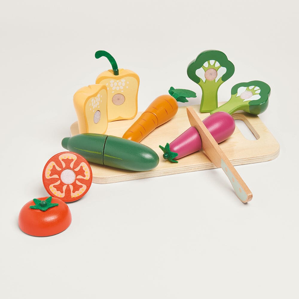 Each chunky wooden piece has a Velcro centre and realistic painted finish. Extend the fun by adding this and our Cutting Fruit Set to our Let’s Bake Kitchen or Play Shop & Cafe.